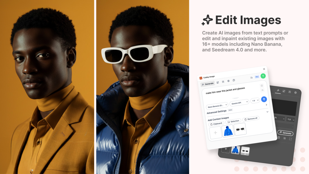 Cubby Image integrates seamlessly with Replicate's API, Google’s Gemini API and fal.ai's API, giving you access to 20 AI models (check the full list here). For example:
