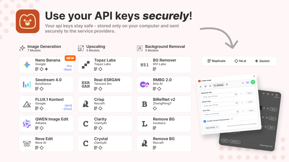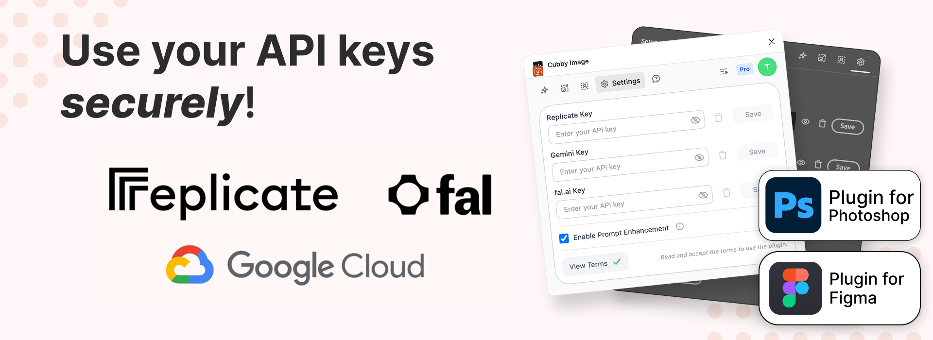 Cubby Image uses an encrypted connection to send your API keys securely through our network layer before reaching the selected AI providers. This ensures a protected hand-off and reliable communication with services like Replicate, fal.ai, and Google Gemini β all while keeping your workflow fast and stable.