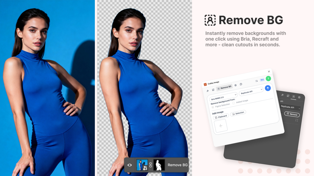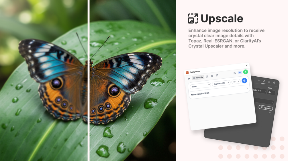 • Upscaling – Enhance resolution and quality without leaving Photoshop or Figma.