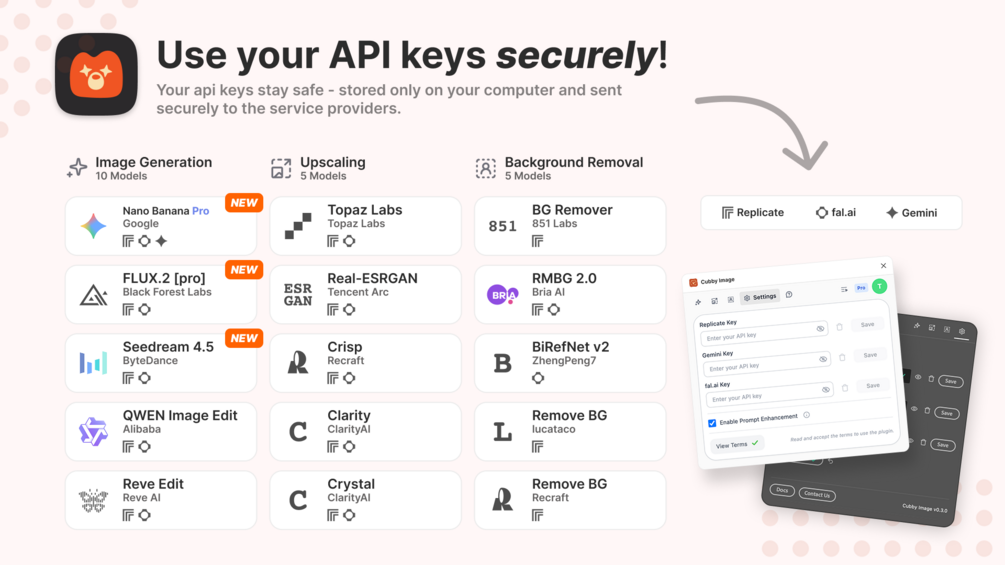 Cubby Image uses an encrypted connection to send your API keys securely through our network layer before reaching the selected AI providers. This ensures a protected hand-off and reliable communication with services like Replicate, fal.ai, and Google Gemini β€” all while keeping your workflow fast and stable.